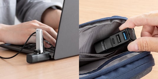 USB Type-C接続に対応しているので、ノートPCだけでなく、タブレットや一部スマートフォンにも接続可能です。外出先でタブレットにキーボードとマウスを繋いで“簡易ノートPC化”したり、USBメモリのデータを素早く読み込んだりと、さまざまなシーンで活躍しますケーブル1本分の感覚で持ち歩けるのに、作業効率は大幅にアップします。