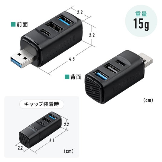 USBハブ コンパクト 小型 USB-A接続 USB3.0 USB2.0 バスパワー USB-Cポート USB Aポート 3ポート コンボハブ 黒色 軽量