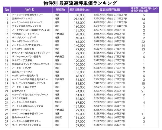 坪単価1,000万円以上の住戸のうち、各物件の中で最も流通時の坪単価が高かった住戸でランキングしてみると、大多数の物件がタワーマンションであることが分かります。とくに上位10物件のうちタワーマンション以外なのは「三田ガーデンヒルズ」「パークマンション三田綱町ザフォレスト」の2物件のみ。そのほかは全てタワーマンションとなり、都心のタワーマンションの相場がいかに突出しているかが分かります。