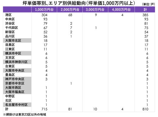 2025年に中古流通した中古マンションを調査したところ、坪単価1,000万円(1平方メートル あたり約300万円)以上の住戸は22の行政区で計810戸ありました。最も供給が多かったのが東京都港区で385戸、2番目に多かったのが東京都中央区で93戸、3番目が東京都渋谷区で81戸、4番目に多かったのが東京都千代田区で75戸、5番目に多かったのが東京都新宿区の54戸となりました。坪単価が2,000万円(1平方メートル あたり約600万円)以上になると6行政区95戸、3,000万円(1平方メートル あたり約900万円)以上になると2行政区14戸、4,000万円(1平方メートル あたり1200万円)以上になると1行政区4戸(東京都港区)のみとなりました。