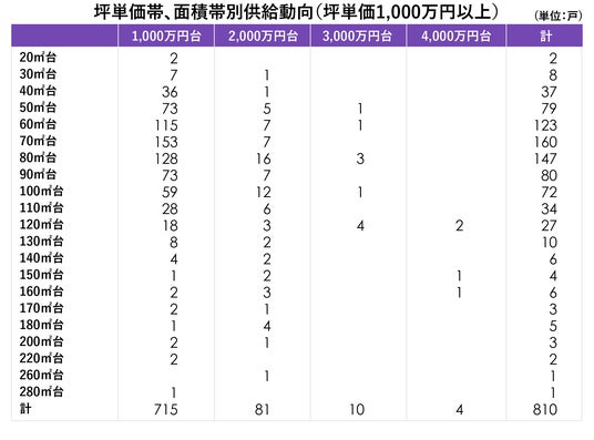 面積帯別に見ると、20平方メートル 台のコンパクト住戸から200平方メートル 以上の広面積プランまで幅広いプランで坪単価1,000万円を超える坪単価で供給されていることが分かります。坪単価2,000万円台でも同様の傾向が見られます。