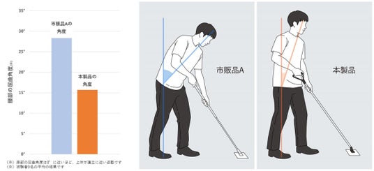 本製品は腰への負担軽減について、大学との共同研究により科学的根拠をもとに検証し、商品設計に反映しています。芝浦工業大学との共同研究では、身体への負担軽減を考慮した柄の長さについての評価実験を行いました。身長の高低に関わらず幅広いユーザーから、使いやすさや力の入れやすさの観点で最も高く支持された柄の長さを採用しています。また九州大学との共同研究*では、本製品使用時の身体への負担軽減因子を定量的に検証しました。モーションキャプチャで掃除動作の姿勢を解析した結果、使用時に上体が直立に近い姿勢を維持でき、腰を深く曲げずに力をかけられることが確認され、本製品が「腰を深く曲げず、ラクな姿勢で掃除しやすい構造」であり、結果として腰への負担軽減に繋がっていると考えております。