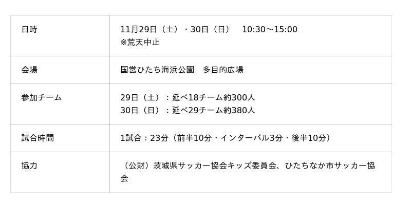 国営ひたち海浜公園の「多目的広場」では、11月29日(土)・30日(日)に、「海・花ちびっこサッカー大会U-9(アンダー ナイン)」を開催します。本大会はジュニアサッカーの普及や技術の向上、地域の枠を超えたサッカー少年団の相互交流を深めることを目的に、2000年から開催しています。日ごろ試合に出場する機会が少ない小学1年生から3年生が活躍し、目まぐるしく攻守が切り替わる熱戦が繰り広げられます。