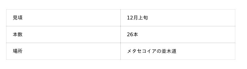 会場から徒歩約3分のところには、メタセコイアの並木道があります。南口付近「泉の広場」から「プレジャーガーデン」を結ぶ約100mにわたる並木道で、紅葉するとレンガのような色合いになります。メタセコイアは現在紅葉はじめで、12月上旬までお楽しみいただける見込みです。