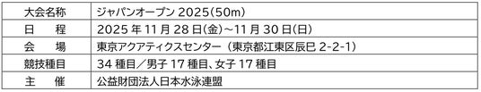 「ジャパンオープン2025(50m)」は、競泳の日本一を決める水泳大会です。日本水泳連盟が主催し、競技種目は、男子、女子ともに、自由形、背泳ぎ、平泳ぎ、バタフライ、個人メドレーの17種目で熱戦が繰り広げられる大会です。