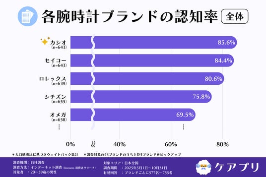 調査の結果、『カシオ』が85.6%で最も高く、次いで『セイコー』が84.4%、『ロレックス』が80.6%でした。続く4位は『シチズン』75.8%、5位は『オメガ』69.5%となりました。