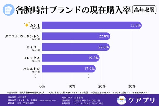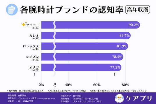 そこで、24時間365日いつでも恋愛の悩みを相談できるチャット占いアプリ「ケアプリ」( https://web.careapp.jp/ )を運営する株式会社ケアプリ(本社:大阪府大阪市、代表:森本貴大)は、働き世代の男性の腕時計選びの実態と高年収層における特徴を明らかにするため、全国の20歳~59歳の男性を対象に、国内外の主要な腕時計ブランドに関する調査を実施しました。