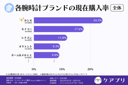 調査の結果、『カシオ』が24.3%で最も高く、次いで『セイコー』が17.6%、『シチズン』が11.8%でした。続く4位は『オリエント』9.3%、5位は『ボーム&メルシエ』9.0%となりました。
