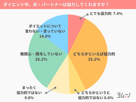「とても協力的(7.4%)」「 どちらかといえば協力的(35.2%)」と回答した方を合わせると、4割以上の夫・パートナーがダイエットに協力的であることが分かりました。