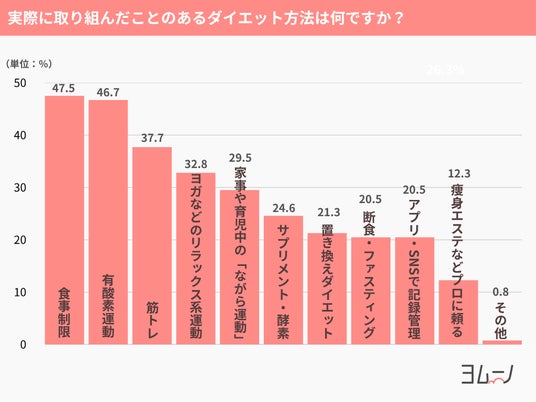 約半数が「糖質制限、カロリー制限などの食事制限(47.5%)」「ウォーキング、ジョギングなどの有酸素運動(46.7%)」に取り組んだ経験がありました。食事制限や運動など定番かつ実践しやすい方法は根強く支持されており、今もダイエット方法の“王道”であると言えそうです。