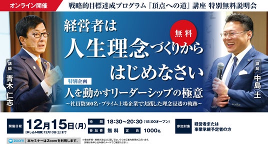 【12/15(月)オンライン開催】青木 仁志と日本青年会議所第71代会頭を務めた中島土氏が理念経営をテーマに無料講演会を開催