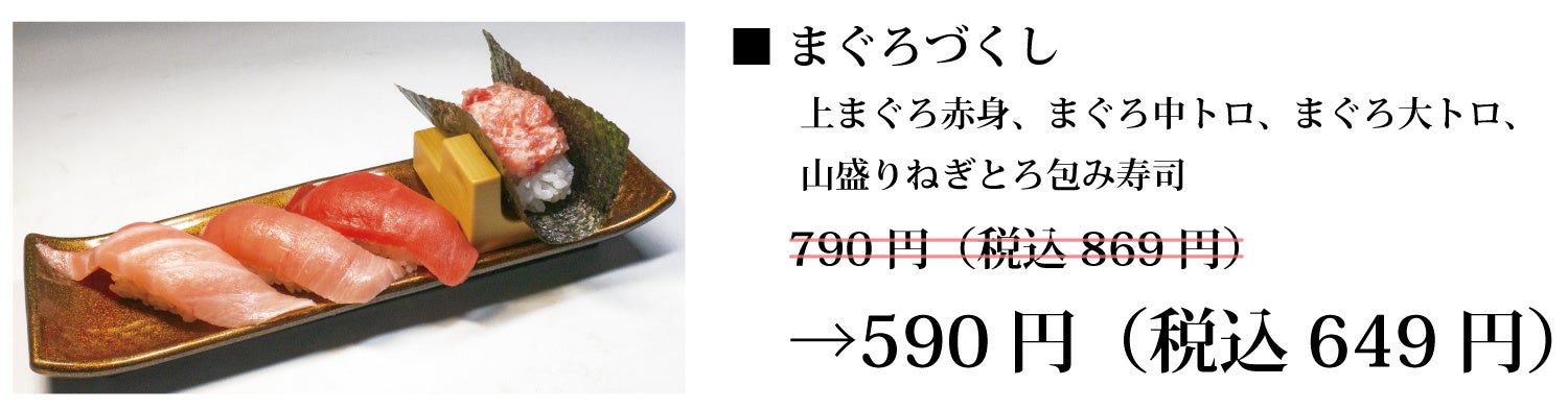 今や、国民の恒例イベントとなりました「BLACK FRIDAY」セールを「平禄寿司」でも11月28日(金)~ 30日(日)までアプリ会員様限定で開催いたします。一皿で4種類のまぐろが楽しめる「まぐろづくし」に「びんちょうまぐろ藁焼きねぎ塩だれ」、「ショコラアイス」の3メニューをお得な価格でご提供いたします。ご来店当日にアプリのインストールでも承ります。どうぞ、ご利用ください。