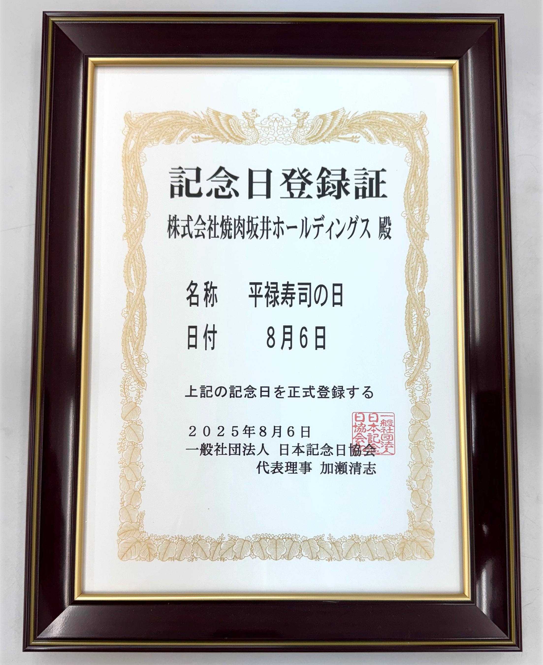株式会社 焼肉坂井ホールディングス(本社:名古屋市北区、代表取締役社長 高橋仁志)は毎年8月6日を「平禄寿司の日」として一般社団法人 日本記念日協会に申請し、承認をいただきました。記念日は1号店がオープンした日が1967年8月6日(日)に由来いたします。
