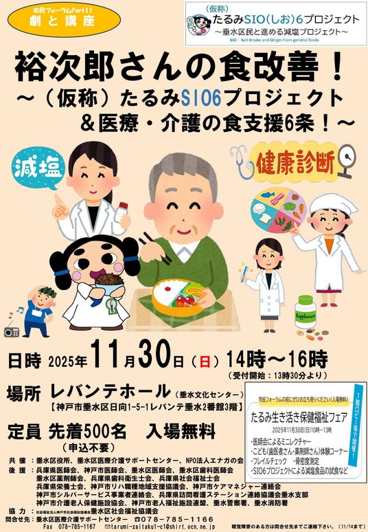 2025年11月30日(日)、神戸学院大学栄養学部および薬学部の学生と、薬学部の白川晶一教授が、神戸市垂水区のレバンテホールにて上演する演劇「裕次郎さんの食改善!」に出演します。