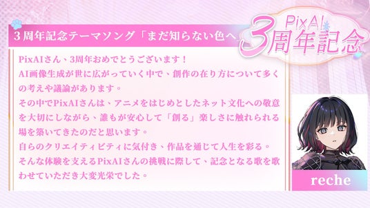 楽曲リリースにあたってreche様より温かいメッセージをいただきました。これからもPixAIはユーザーの皆様の「創る」楽しさに寄り添うプラットフォームであり続けます。