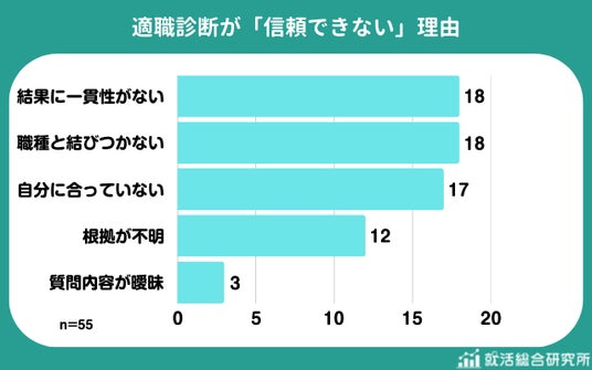 適職診断が「信頼できない」と感じる理由として最も多かったのは「結果に一貫性がない(18人)」と「職種と結びつかない(18人)」で、診断結果が具体的なキャリア選択につながらない点が不信感につながっていました。