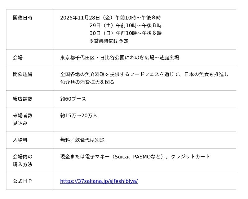 全国各地の魚介グルメが味わえる「SAKANA&JAPAN FESTIVAL(魚ジャパンフェス)2025 in 日比谷公園」(主催・SAKANA&JAPAN FESTIVAL実行委員会)が2025年11月28日(金)~30日(日)の3日間、東京都千代田区の日比谷公園で開催されます。魚ジャパンフェスは、四方を海に囲まれた日本の大切な食文化で、栄養豊富な「魚食」の活性化を目的に開催している、累計来場者数が250万人に上る日本最大級の魚介グルメフェスティバルです。