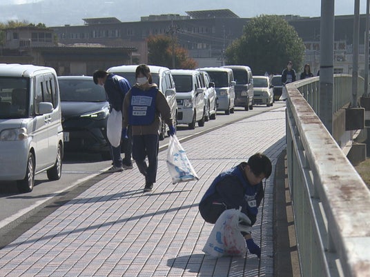 橋の上のごみを拾う参加者