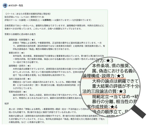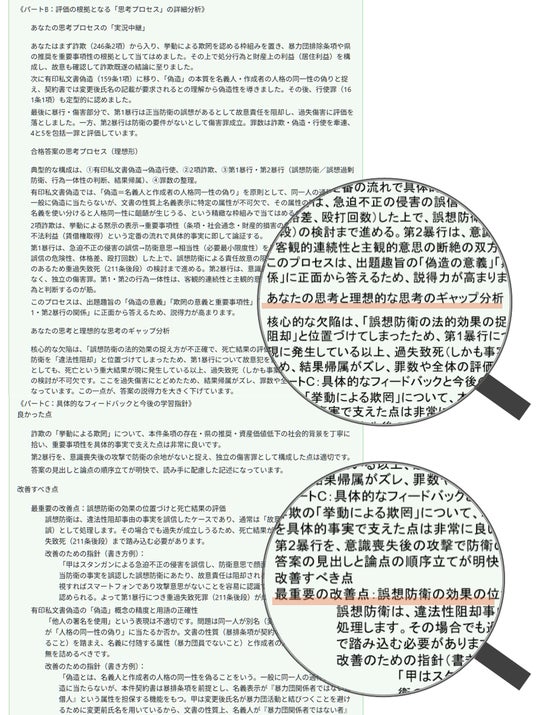 本サービスは、実際の予備試験CBT方式を想定した学習体験を提供します。受講生がオンラインのプラットフォーム上でPCを使い答案を作成し提出すると、AIが即座に分析を開始。これまで1週間以上かかっていたフィードバックが、数分で手元に届きます。これにより、自身の思考プロセスを忘れることなく、熱意が冷めないうちに深い復習を行うことが可能になります。 提供されるフィードバックは、以下の3つの要素で構成されています。➊思考の「健康診断」