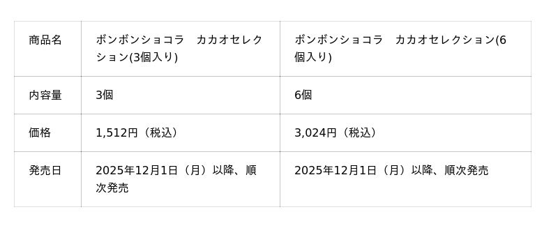 江崎グリコ株式会社は、スイスのOro de Cacao社が持つ「コールドエクストラクション(TM)」でカカオのおいしさを引き出すチョコレートブランド「Tunmel(トゥンメル)」より、新たに「Tunmel ボンボンショコラ カカオセレクション」を2025年12月1日(月)以降、順次発売します。「カカオ、砂糖、生クリーム、水あめ」の4つの原料を使用したくちどけの良いガナッシュを、ハイカカオチョコレートで包み込み、ボンボンショコラに仕上げました。産地ごとに異なるカカオの個性ゆたかな風味をお楽しみいただけます。