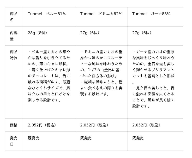デビューから2年目となるチョコレートブランド「Tunmel」から産地の異なる3種のハイカカオチョコレートを使用したボンボンショコラが新登場
