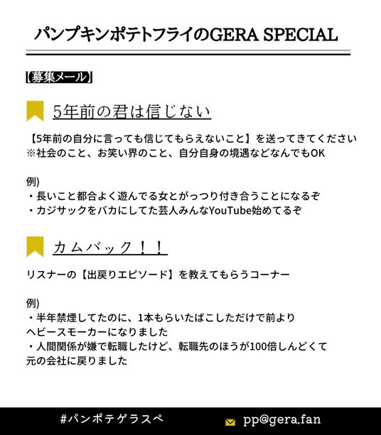 そのほか、GERA NEXT時代のリスナーからのメッセージ(感想・印象的なこと)もお待ちしております。