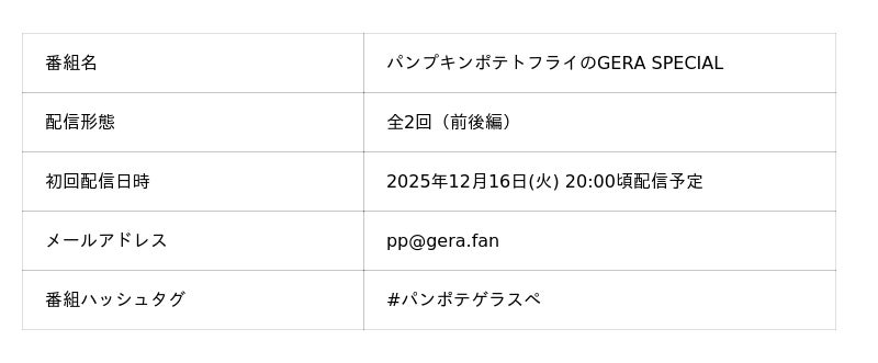 プロシューマー支援事業を展開する株式会社ファンコミュニケーションズ(本社:東京都渋谷区、代表取締役社長:二宮幸司 東京証券取引所プライム市場:2461)が運営する、国内最大級のお笑いラジオアプリ「GERA(ゲラ)」にて「パンプキンポテトフライのGERA SPECIAL」の配信が決定いたしました。