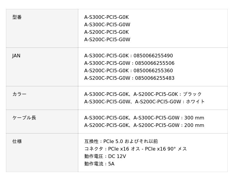 - 最大128 GB/s(理論値)の転送速度を発揮するPCIe 5.0 対応ライザーケーブル