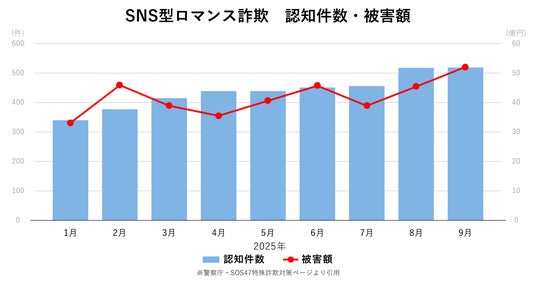 SNSやマッチングアアプリで知り合った相手に、恋愛感情や親近感を抱かせ、信頼を得た後にお金をだまし取る「SNS型ロマンス詐欺」が急増中です。クリスマスや年末年始にかけて、SNSやマッチングアプリの利用が増えやすい時期には特に注意が必要です。警察庁の資料によると、令和7年9月末時点で、SNS型ロマンス詐欺は認知件数3,964件(前年同期比+1,360件、+52.2%)、被害額376.0億円(前年同期比+102.1億円、+37.3%)と前年を大きく上回り、被害が増加しています。