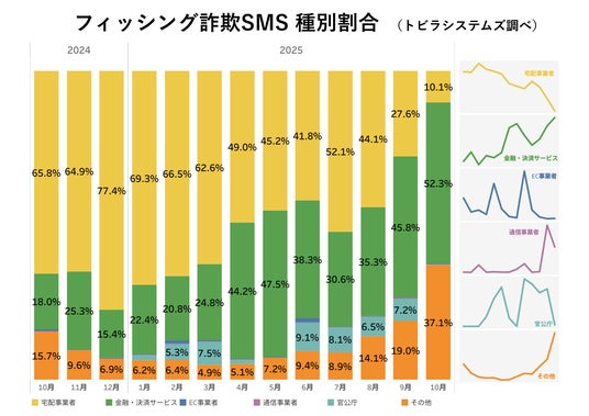 ○詐欺SMSの文面ジャンルが拡大、生成AI悪用かトビラシステムズの調査で、2025年10月に確認されたフィッシング詐欺のSMSの種別割合は、金融・決済サービスをかたる手口が増加し、52.3%を占めました。