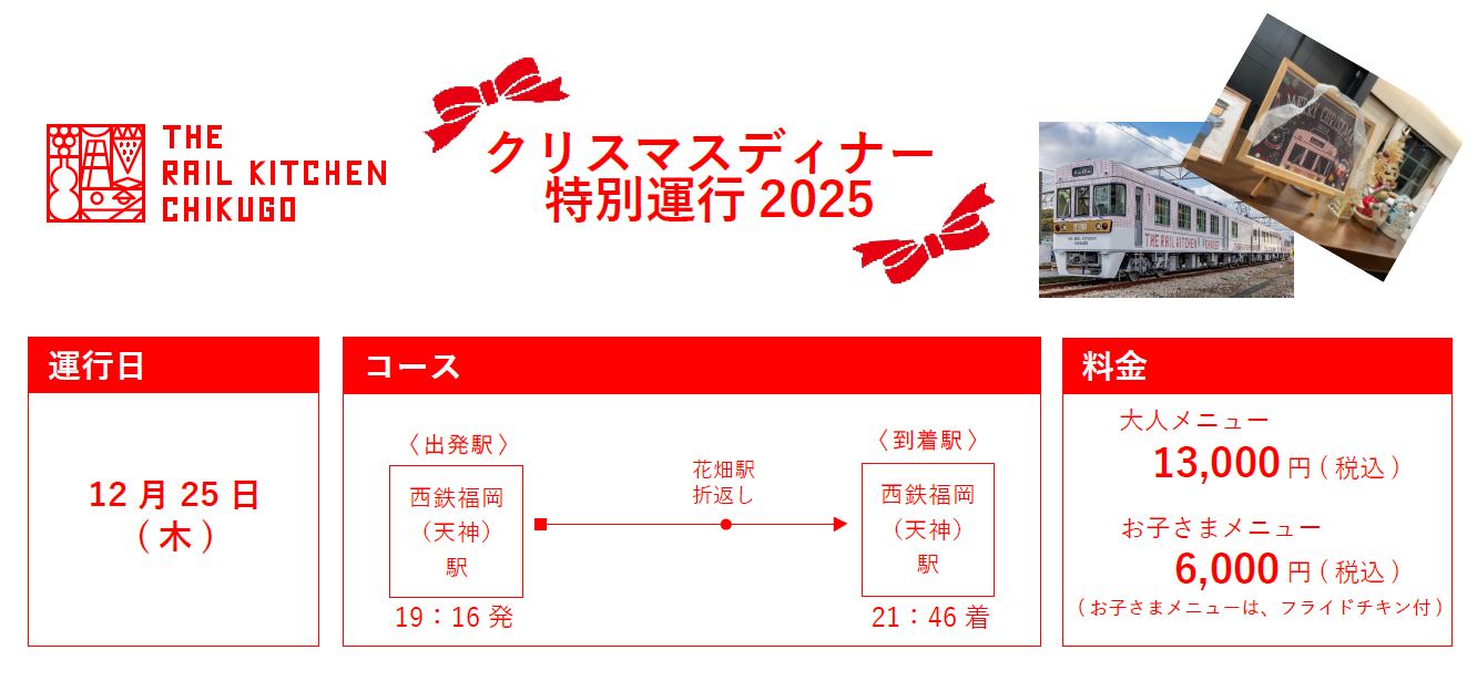 西日本鉄道(株)では地域を味わう旅列車「THE RAIL KITCHEN CHIKUGO」において、2025年12月25日(木)に、クリスマスディナー特別運行を開催します。