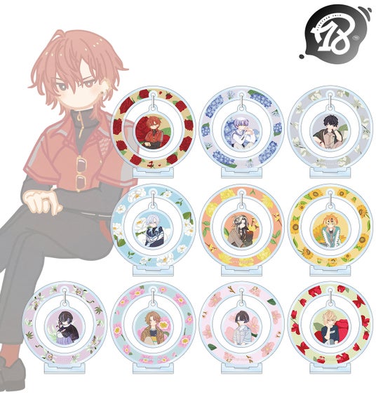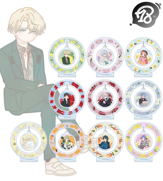 北片 來人、畔川 幾成、夏焼 千弥、木ノ内 太緒、百目鬼 潜、蜂乃屋 凪、白光 糖衣、白光 琉衣、棗 夜鷹、夜半 子タろのイラストをボタニカルデザインに落とし込んで繊細なタッチで新たに描き起こし、ゆらゆら動くアクリルスタンドに仕上げました。