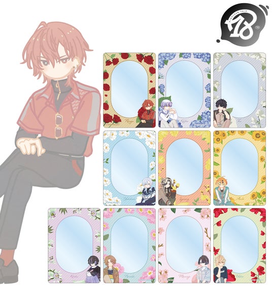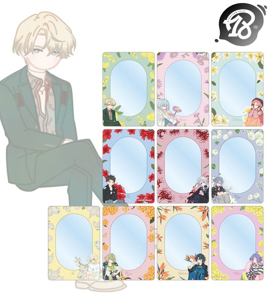 北片 來人、畔川 幾成、夏焼 千弥、木ノ内 太緒、百目鬼 潜、蜂乃屋 凪、白光 糖衣、白光 琉衣、棗 夜鷹、夜半 子タろのイラストをボタニカルデザインに落とし込んで繊細なタッチで新たに描き起こし、カードステッカーに仕上げました。
