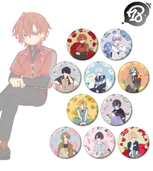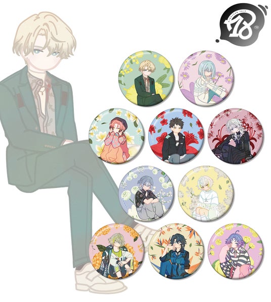 北片 來人、畔川 幾成、夏焼 千弥、木ノ内 太緒、百目鬼 潜、蜂乃屋 凪、白光 糖衣、白光 琉衣、棗 夜鷹、夜半 子タろのイラストをボタニカルデザインに落とし込んで繊細なタッチで新たに描き起こし、缶バッジに仕上げました。