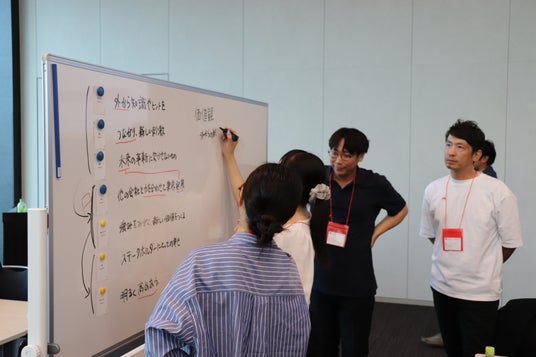 をホワイトボードにまとめました。その後、全体に向けて各チームが発表し、参加者全員にそれぞれの価値観を共有しました。モルックを通じた一体感に加え、MICE業界の未来を見据えた価値観を議論・共有することで、交流の場はさらなる広がりを見せました。