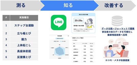 体力測定を実施し、参加者がご自身のスマートフォンからLINEミニアプリに結果を入力する ことで即時でフィードバックを得られるほか