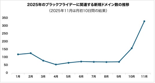 毎年恒例のショッピングシーズンが到来すると、新規ドメインの登録が急増し、犯罪者は不正インフラを作り出して紛れ込む好機を得ます。本年10月にはブラックフライデー関連の新規ドメイン登録が158件に上り、2025年の月間平均との比較で93%増という驚異的な増加を記録しました。11月上旬にはさらにその増加が加速し、上旬の10日間で330以上の関連する新規ドメインが出現しています。