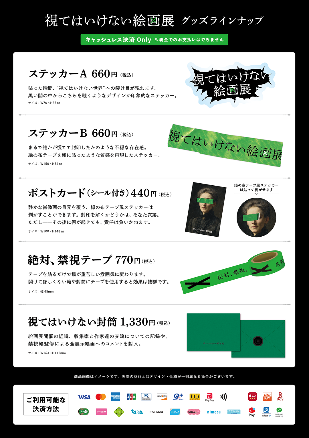 さらには、グッズのラインナップも公開され、本展示らしいユニークなアイテムが揃っています。本展示に込めた想いに触れることができる「視てはいけない封筒」は、より深く展示の背景を知る資料となっています。グッズは会場にてお買い求めいただけます。