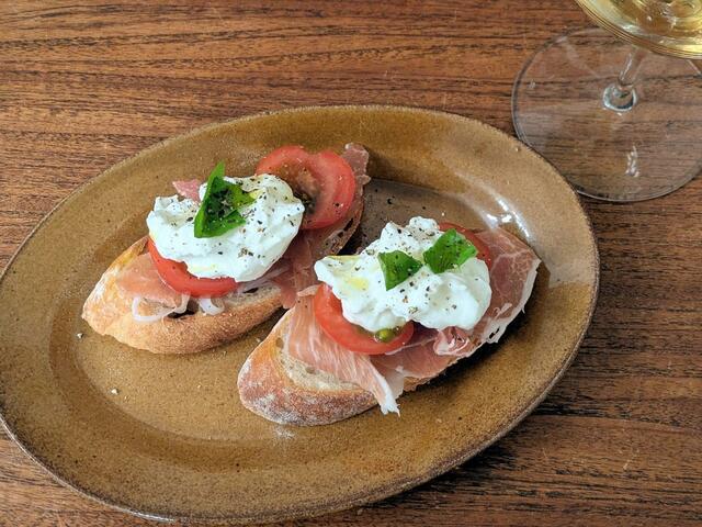 バゲットを軽くトーストして、生ハムやトマトの上にグリークヨーグルトをのせたら、ハーブをぱらり。