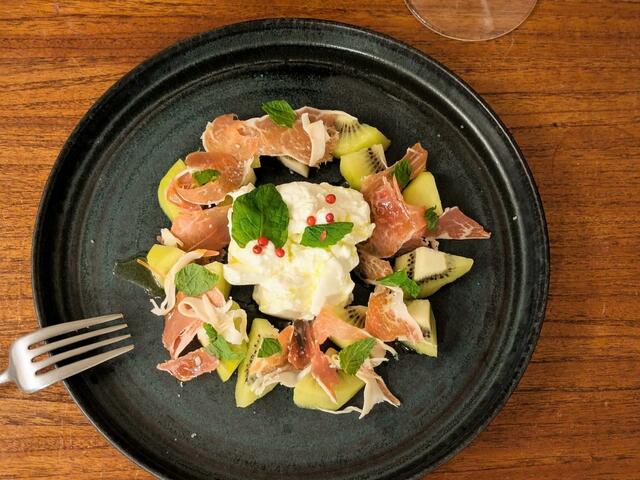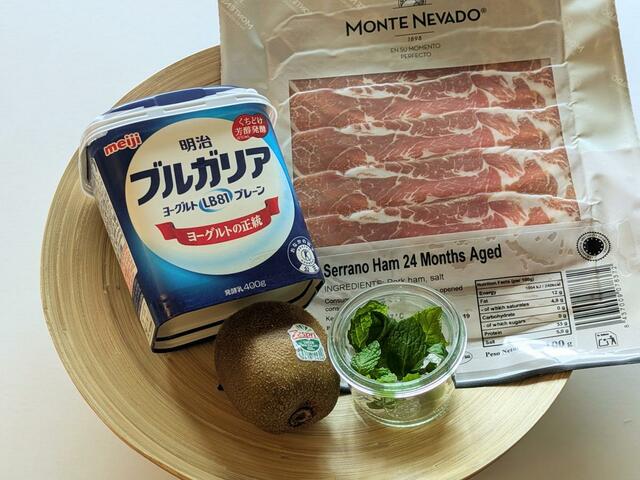 キウイの甘酸っぱさと生ハムの塩気、そしてヨーグルトの濃厚なコクが絶妙にマッチ。