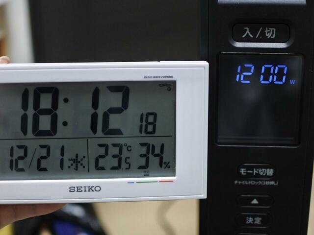 今回は、温度モード・節電モード・パワーモードの3種類のモードがあるなかで、すぐに暖まりたいときによく使っているパワーモードの1200W(強)で試してみることに。