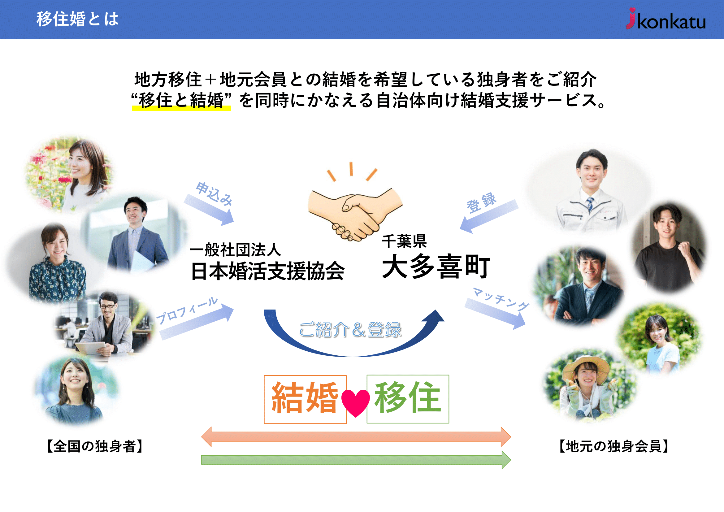 『移住婚』は、地方移住を希望する独身者に向け、結婚相手の紹介と移住支援を一体的に行う全国初の公的結婚支援モデルです。一般社団法人日本婚活支援協会と地方自治体が連携し、出会いの提供にとどまらず、結婚後の暮らし・住まい・仕事・子育て環境までを包括的にサポートすることで、持続可能な地域づくりを目指しています。