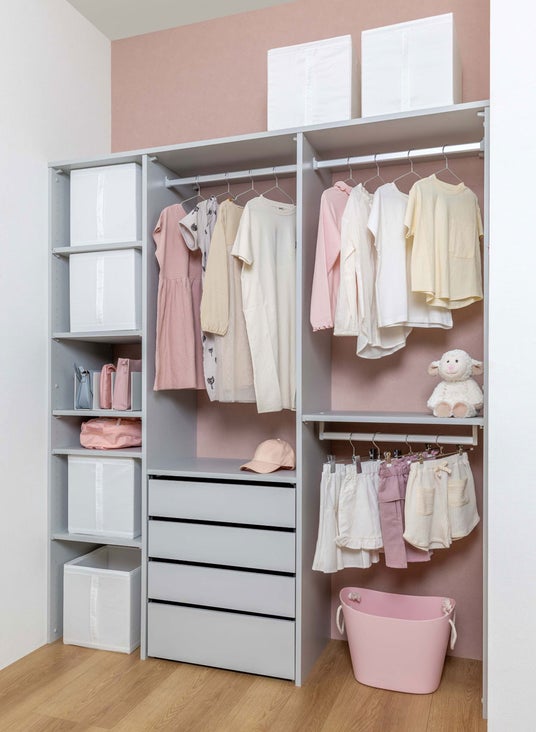 可愛くて使いやすいキッズクローゼット。パールグレーはアクセントクロスとの調和が取れた空間を実現します。