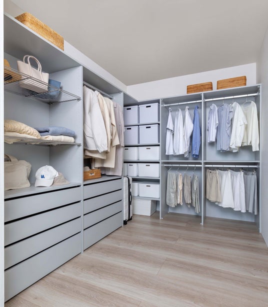 モダンで明るいL型ウォークインクローゼット 。パールグレーはソフトで優しい空間を実現します。