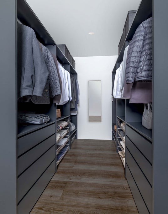 洗練されたII型 ウォークインクローゼット 。ダークグレーはクールに魅せる空間を実現します。