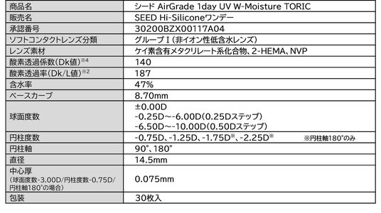 シード AirGrade 1day UV W-Moisture TORIC 商品特長・概要