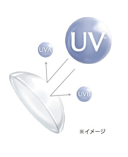 シミ等、肌の色素沈着の原因となる紫外線(UV)は、白内障等の眼病を引き起こす原因のひとつといわれています。レンズに紫外線吸収剤が含まれていますので、瞳に有害といわれる紫外線をカットします。(UV吸収剤を配合したコンタクトレンズは、UV吸収サングラスなどの代わりにはなりません。また、瞳に入るすべての紫外線をカットするわけではありません。)