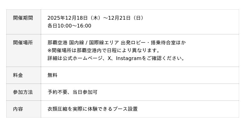 洋服などの衣類を “手のひらサイズ” に圧縮するサービスが体験できる実証実験を、那覇空港で12月18日(木)から12月21日(日)まで開催