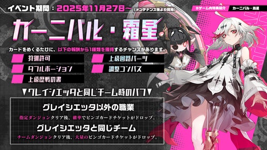 「グレイシエッタ」と一緒に冒険すると特別なバフがあります。「グレイシエッタ」以外の職業の場合、指定ダンジョンをクリアすると、ビンゴカードチケットがドロップするチャンスがあります。「グレイシエッタ」と同じチームでダンジョンに挑戦すると、チームダンジョンクリア後、大量のビンゴカードチケットがドロップできます。