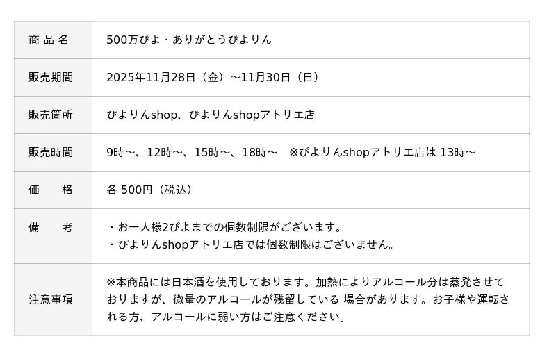 ジェイアール東海フードサービス株式会社(本社:名古屋市、代表取締役社長:岩下賢一)は、人気スイーツ「ぴよりん」の累計販売数が2025年11月27日(木)に500万ぴよに達成する見込みであることを記念し、感謝の気持ちを込めた特別商品「500万ぴよ・ありがとうぴよりん」を、2025年11月28日(金)~11月30日(日)の3日間限定で販売いたします。酒米「五百万石」を使用した愛知県産日本酒のゼリーを使った期間限定のぴよりんです。 なお、期間中に商品ご購入いただいたお客様には、限定デザインの「500万ぴよ・ありがとうぴよりん缶バッジ」を数量限定でプレゼントいたします。